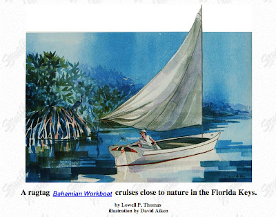 Above is the cover art for Dinghy Down the Keys, published in SBJ February/March of 1990 (their last full year of publication). Lowell P. Thomas tells his story of sailing a home built 14' Bahama style dinghy - built for $300 - down the Florida Keys. Thomas tells us about the boat, the trip, navigation and sleeping on board. It is the story of mangroves and crystal clear water, a simple boat and a simple, relaxing journey.