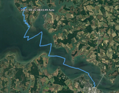 More wind off the Tred Avon, making 4.2 knots with a skipjack off the bow heading to Cambridge. Must be something going on there this weekend. At 2:00 the wind falls off, we make wide tacks on the Choptank hoping for Steve's Cove on the for side of Broad Creek or maybe even Tilghman Island for the night.